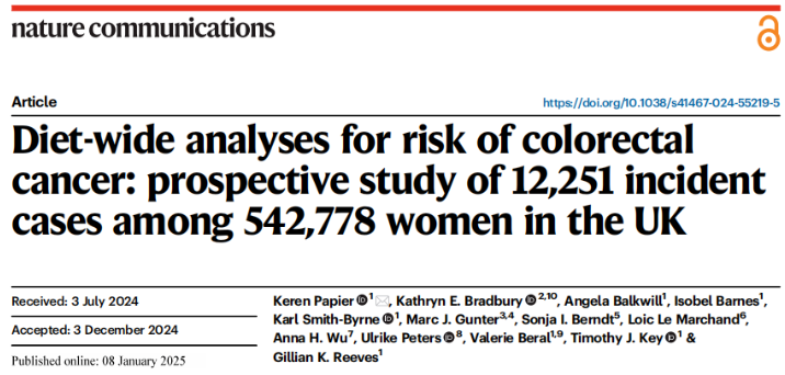 近期,一项发表在Nature Communications上的大规模研究,分析了542,778名英国女性的数据,随访长达16.6年,确定了12,251例结直肠癌患者,深入探究了97种饮食因素和结直肠癌风险的关联。