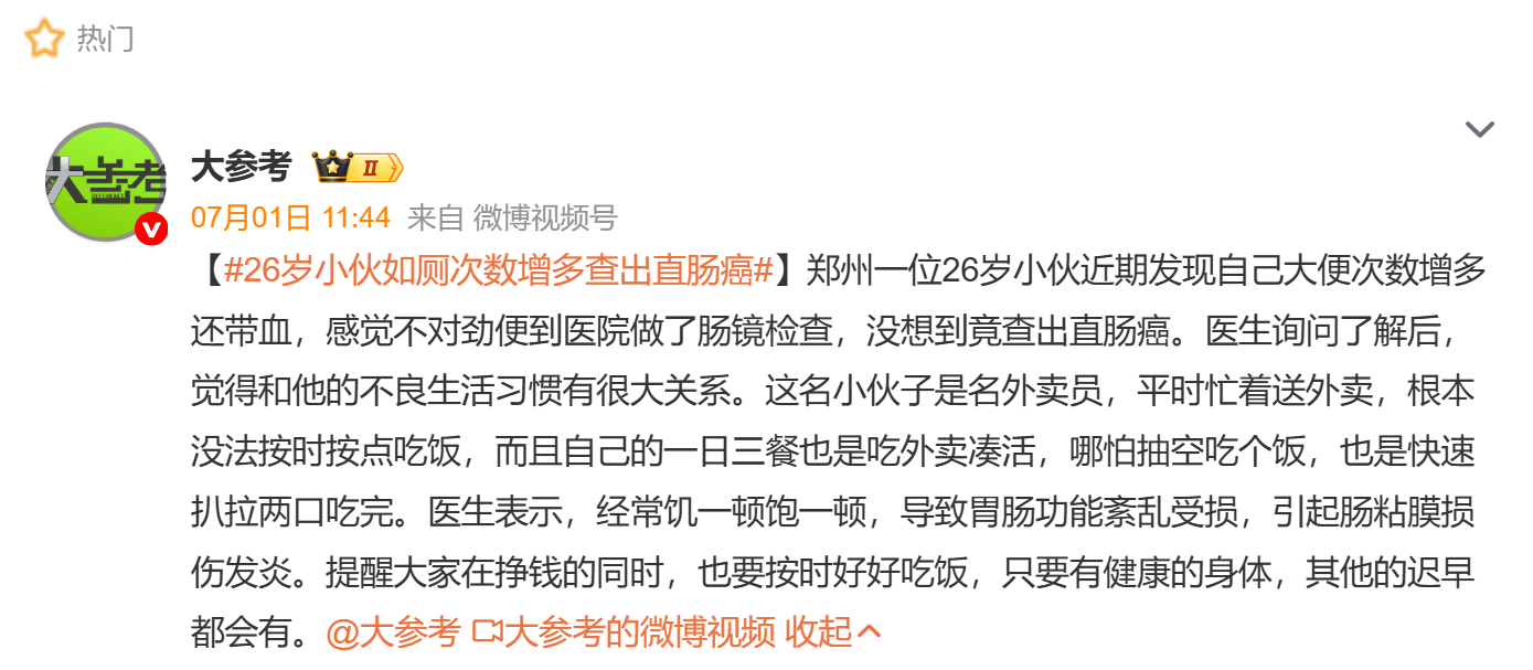 最近,“26 岁小伙如厕次数增多查出直肠癌” 这一话题登上微博热搜,引发众多关注。这位年轻的外卖员因工作忙碌,饮食极不规律,常常饥一顿饱一顿。久而久之,他发现自己大便次数明显增多,且伴有便血症状。起初,他并未重视,以为是普通肠胃问题。直到身体不适愈发严重,才前往医院检查,结果竟被确诊为直肠癌。一个年轻的生命,就这样被肠癌无情地盯上,令人痛心不已,也为我们敲响了健康警钟。