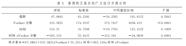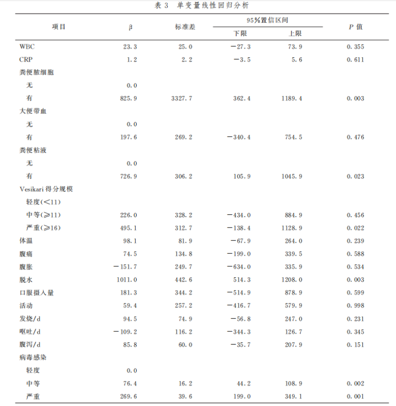 单因素线性回归分析显示Vesikari评分,粪便脓细胞,粪便粘液和脱水均与粪便钙卫蛋白水平具有相关性。