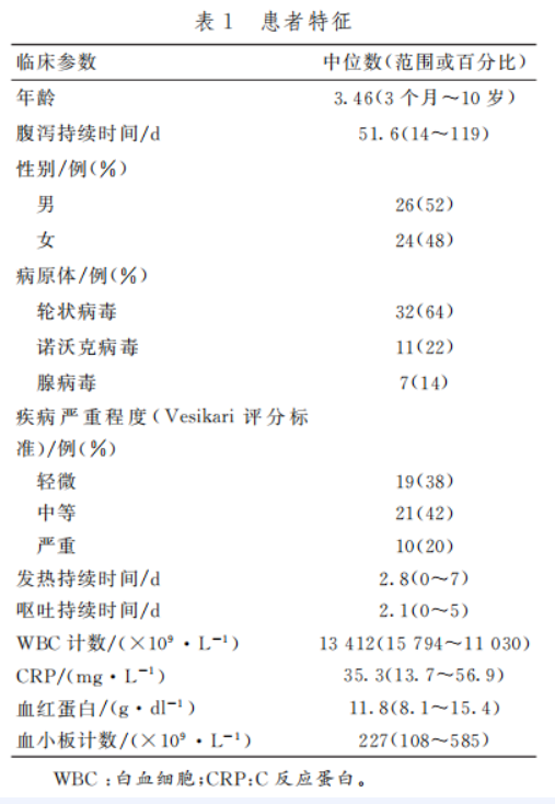 收集在2016年1月-2017年12月到北京市儿童医院保定医院就诊的病毒性腹泻的儿童50例。