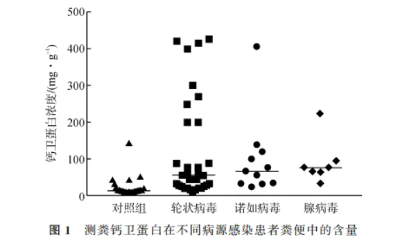 轮状病毒感染患者粪便钙卫蛋白浓度为89(11-426)mg/g,在诺如病毒感染患者和腺病毒感染感染患者中,粪便钙卫蛋白的浓度分别为93(25-405)mg/g和95(65-224)mg/g,而对照组的粪便钙卫蛋白的浓度为43(10-145)mg/g。