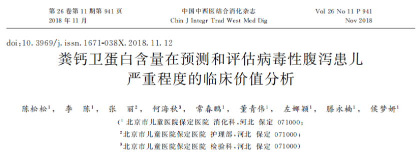 今天要分享一篇近期发表于《中国中西医结合消化杂志》的文章,由北京市儿童医院保定医院团队开展研究,研究纳入50例病毒性腹泻患儿(含轮状病毒 、诺如病毒、腺病毒),检测粪钙卫蛋白水平,发现诺如病毒(93mg/g)、腺病毒(95mg/g)感染患儿粪钙卫蛋白水平高于轮状病毒感染患儿(89mg/g),且重度(843mg/g)、中度(402mg/g)患儿水平显著高于轻度患儿(87mg/g),分析证实粪钙卫蛋白与疾病严重程度显著相关(P<0.0001),最终结论为粪钙卫蛋白可作为儿童病毒性腹泻的非侵入性诊断与严重程度评估标志物。