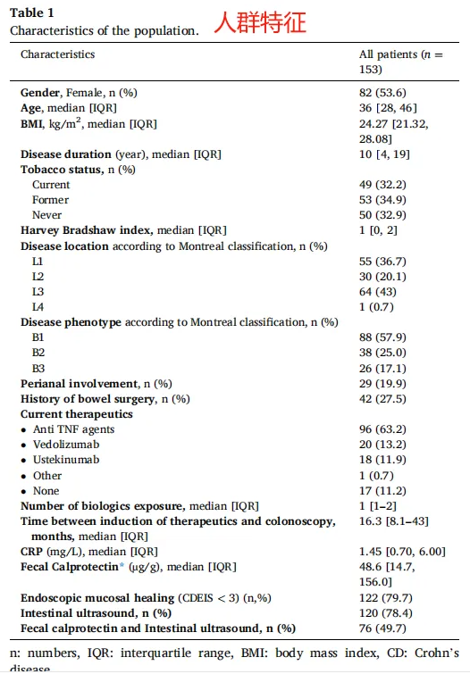 共纳入153名在法国亚眠大学医院2019年9月至2022年4月期间,连续接受结肠镜MH评估的CD患者,且在结肠镜前后4周内完成IUS和/或FC检测。