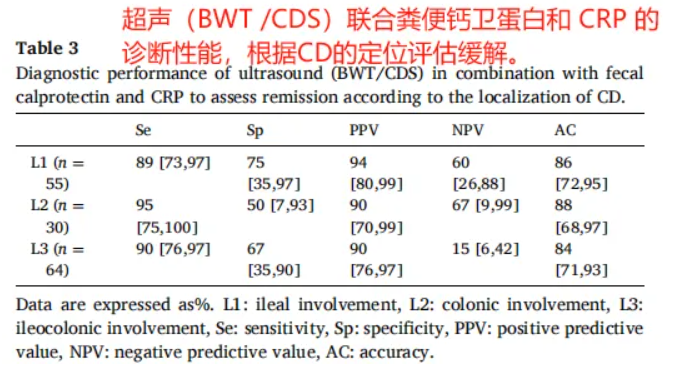 不同疾病位置表现回肠型(L1)PPV94%、结肠型(L2)PPV90%、回结肠型(L3)PPV90%