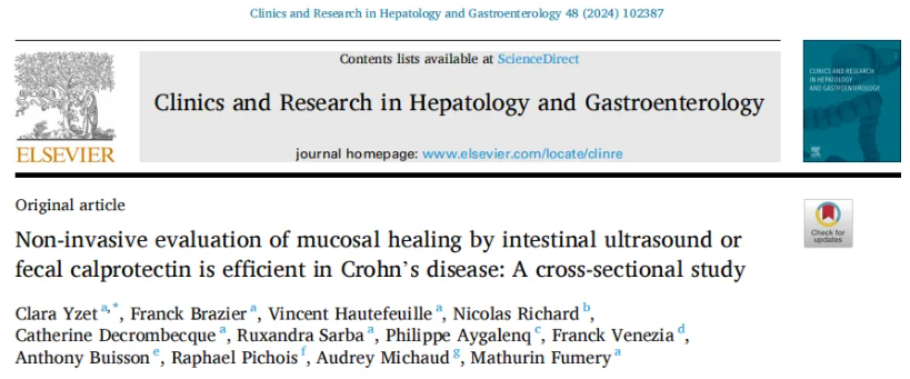 今天要分享一篇2024发表于《肝病与胃肠病学临床与研究》的文章,本研究为一项横断面研究,纳入2019 年9月至2022年4月期间153名接受结肠镜黏膜愈合(MH)评估的克罗恩病(CD)患者,旨在评估肠道超声(IUS)和粪便钙卫蛋白(FC)作为无创手段评估CD黏膜愈合的有效性,以结肠镜(CDEIS评分<3为MH标准)为金标准。研究结论为IUS和FC均为评估CD患者内镜下黏膜愈合的有效无创替代方案,可根据临床可行性和患者接受度选择使用。