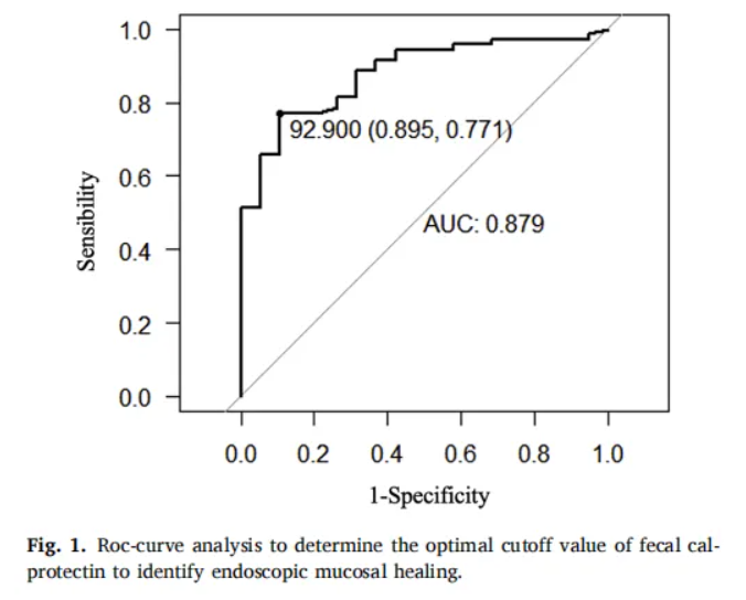 以粪便钙卫蛋白(FC)<250µg/g预测内镜下黏膜愈合(MH)的灵敏度(Se)、特异度(Sp)、阳性预测值(PPV)和阴性预测值(NPV)分别为91%、63%、90%和67%,6例MH患者的FC水平>250µg/g)。鉴别内镜下黏膜愈合的最佳临界值为<92.9µg/g,对应的灵敏度、特异度、阳性预测值和阴性预测值分别为77%、89%、96%和67%。