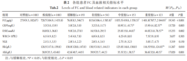UC患者FC浓度明显高于对照者。进一步两两比较,发现活动期各组UC患者FC水平亦高于对照组(P<0.05),缓解组与对照组差异无统计学意义(P=1.00)。疾病组各期患者FC及相关血液指标CRP、ESR、WBC、NLR、Hb、Alb对比,发现各组间FC、CRP、ESR、Hb、Alb差异有统计学意义(P< 0.05),而WBC和NLR差异无统计学意义(P=0.303、0.150)。中度活动期UC患者FC、ESR显著高于缓解期,轻度活动期UC患者FC显著高于缓解期。见表2。