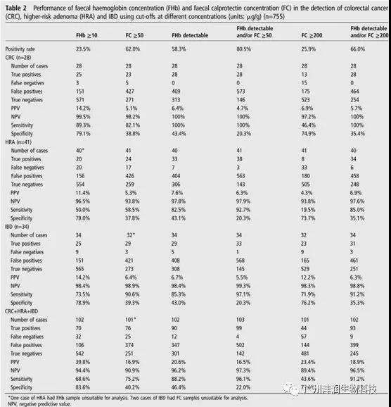 2016年,对于消化道首诊,CraigMowat等在Gut杂志上发表了一篇关于如何利用定量FHB和定量FC判断结直肠癌、高风险腺瘤和炎症性肠炎的文章。文章研究了共1043名患的FC和FHB。共计收回755名患者的粪便样本。有患者均为首诊患者,排便习惯改变患者323名,便血患者258名,腹泻患者127名,贫血患者67名,腹痛患者83名,体重减少患者7名,肠道大块粪石2名。60%的患者FC>50μg/g。57.6%的患者检测到FHB(Range 0-200μg/g)。作者选取了FHB≥10μg/g,FC≥50μg/g,FC≥200μg/g和FHB任意出血(FHB Detectable)为阈值来研究结直肠、高风险腺瘤和炎症性肠炎。如图2所示,CRC、HRA和IBD病人中,以FHB≥10μg/g为阈值,其特异性在相比同组其它阈值最高,分别为79.1%,78.0%和78.9%。以FC≥200μg/g为阈值,其特异性与同组FHB差异不大,分别为74.9%、73.7%、76.2%。而"FHB