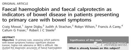 小编注:消化道疾病种类众多,其他具有器质性变化的疾病如症状性憩室病的FC水平平均值有报道为477μg/g,以6μg/g为FHB阳性阈值,阳性率为50%。可能憩室病粪便血红蛋白含量相比本文三种疾病低。非症状憩室病的FC平均值为63μg/g,FHB≥6μg/g为阈值,阳性率为17%。细菌性腹泻FC中位数可达436μg/g。